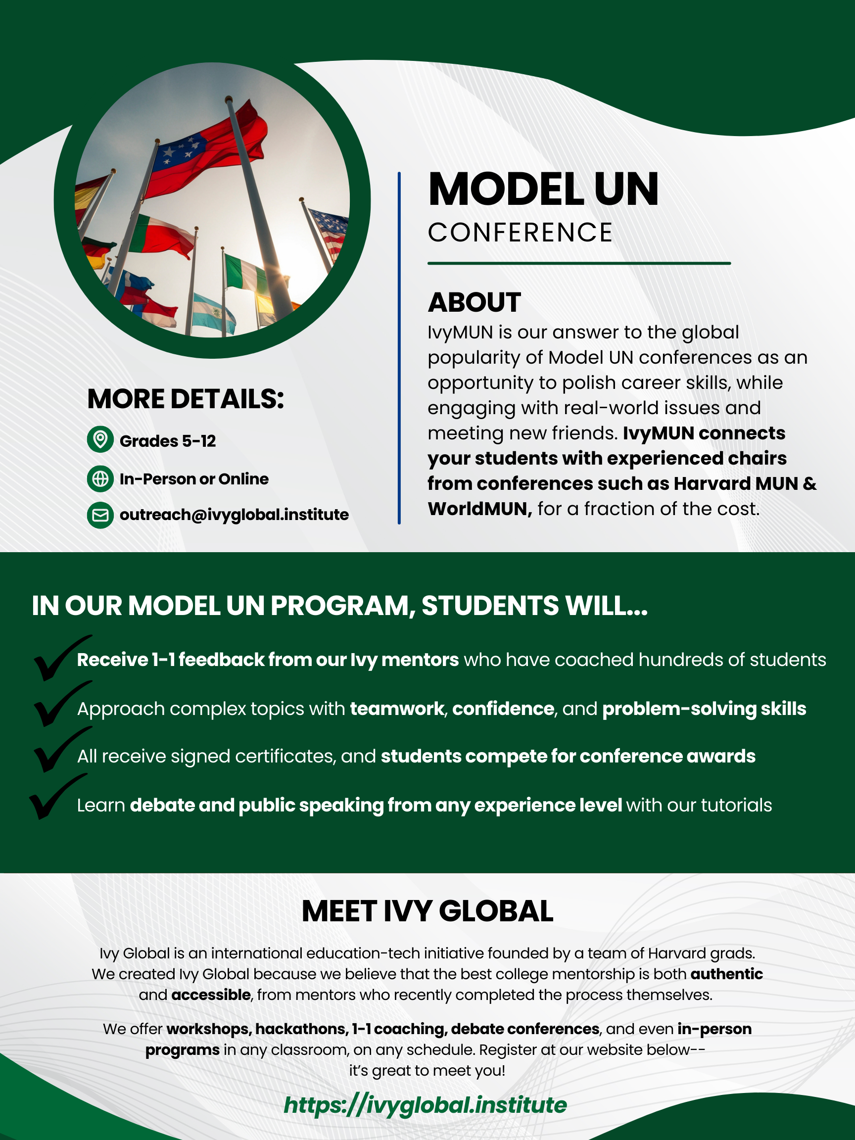 Note that virtual conferences may be attended by individual students, and registration can be accessed at the “IvyMUN” menu link above.